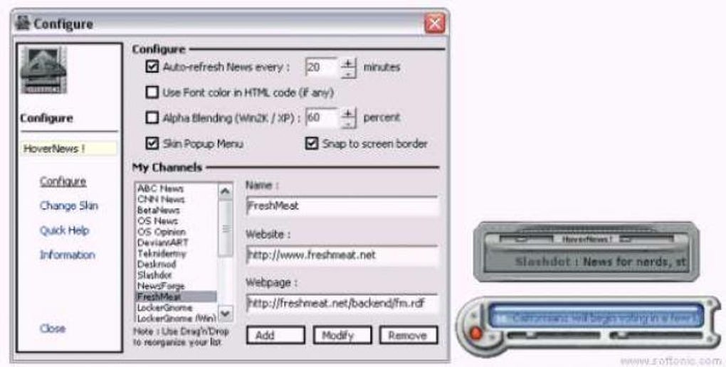 El programa muestra una pequeña ventana en tu escritorio, cuyo aspecto puedes modificar totalmente mediante el uso de skins, en la que se vas mostrando los titulares de los canales de noticias seleccionados por el usuario, trabajando con datos RSS y RDF.